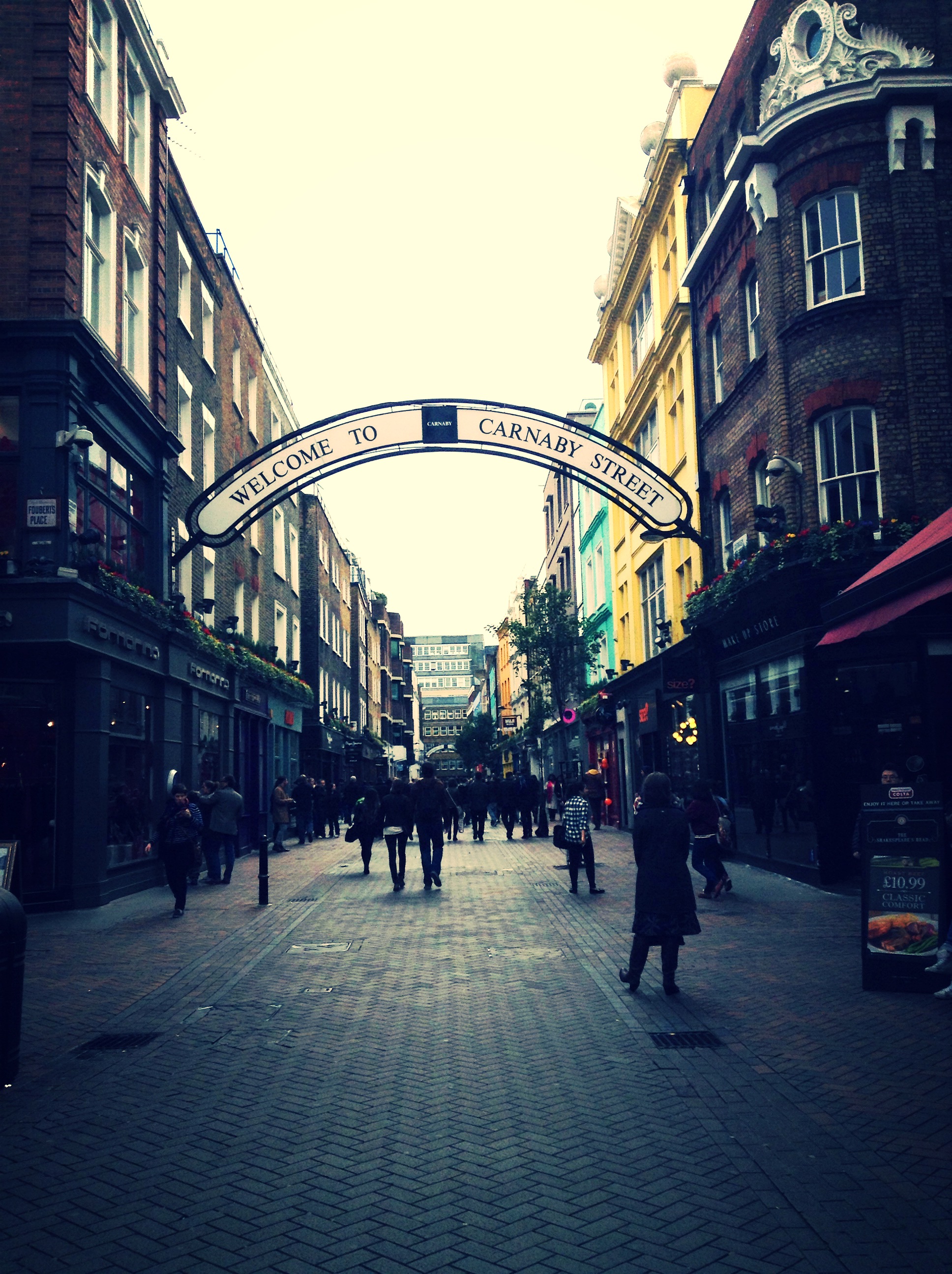 I took the Tube down just a few stops to Oxford Street, where I found a map and figured out how to get to Soho, wanting to avoid the giant TopShop and H&M before me. I stumbled right onto Carnaby Street, the brightly colored mini shopping district. A mix of eclectic boutiques and restaurants as well as popular chains, I got lost in its alleys while wandering in the rain, stopping to buy myself a gorgeous necklace, which I couldn’t resist after shopping for so many other people earlier! However, I did manage to refrain from buy another faux fur jacket, so I was proud of myself for that.